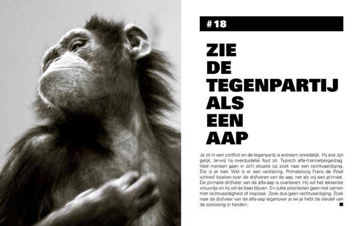 Deze bundel biedt succesvolle strategieën om conflicten te voorkomen of op te lossen. Mede ontwikkeld door Winston Churchill, Al Capone, Harvard University, talloze bereidwillige advocaten, 3 bonobo’s, 2 zoenende boksers, 1 cowboy, Mikhail Gorbatsjov, Sun Tzu en John Rambo.